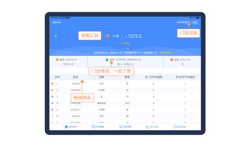 使用易售樂RFID智慧盤點系統,1000平米左右的服裝店鋪,盤點時間從1天左右縮短到30分鐘左右,效率有效提升,準確性也更高